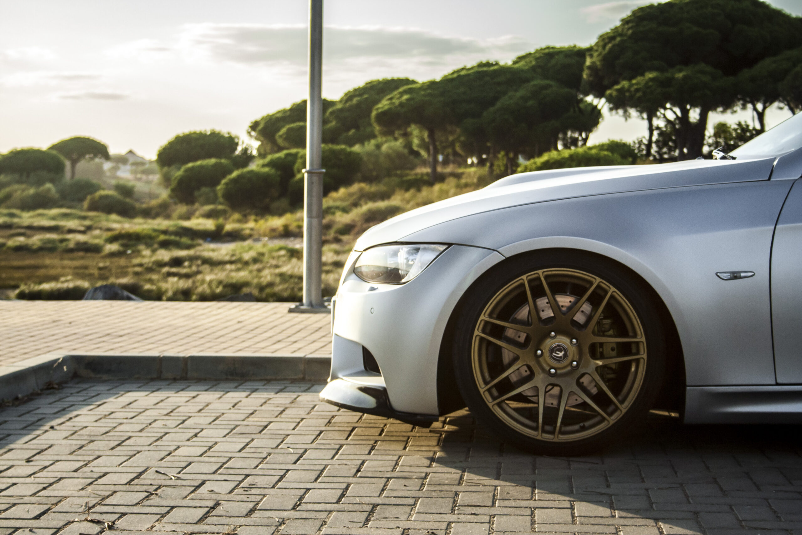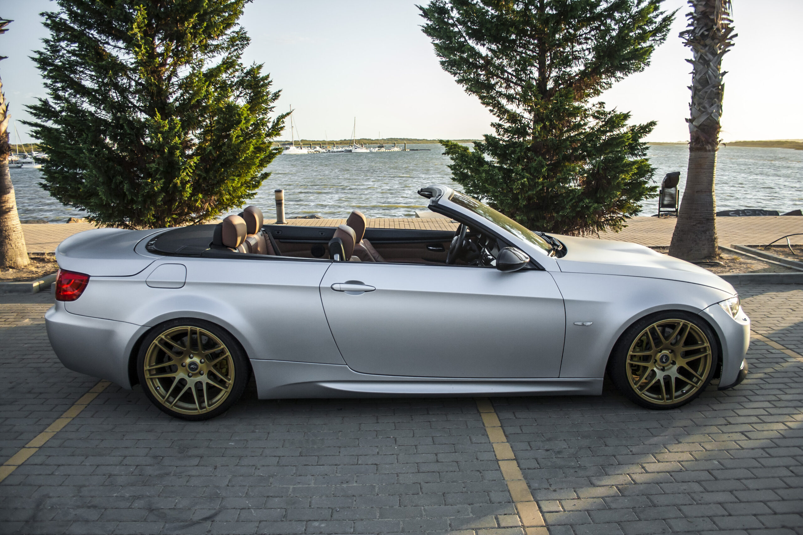 Lo pintamos en gris plata satinado y cambiamos completamente el interior a marrón teja. En aquella época eso no era lo habitual. Las llantas Forgestar F14, 9,5×19 Deep Concave delante y 10×19 Super Deep Concave detrás en acabado dorado, terminaron de darle identidad. Fue una decisión arriesgada. Precisamente por eso funcionó.